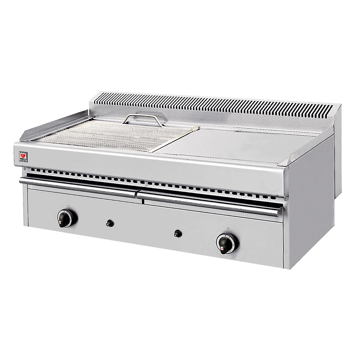 Tisch-Gasgrills mit Wasserschublade mit 1 Edelstahlgrill und 1 Glatteisenplatte.